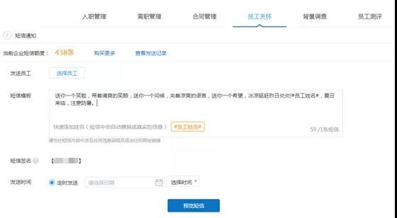 結(jié)合短信通知功能,我們提前編輯好祝福信息或通知,系統(tǒng)到期自動發(fā)放,且短信是包 含企業(yè)簽名的。而提前收到通知的人事也有充足的時間給員工準備相關(guān)活動或禮物,大幅度 增強歸屬感。