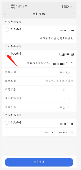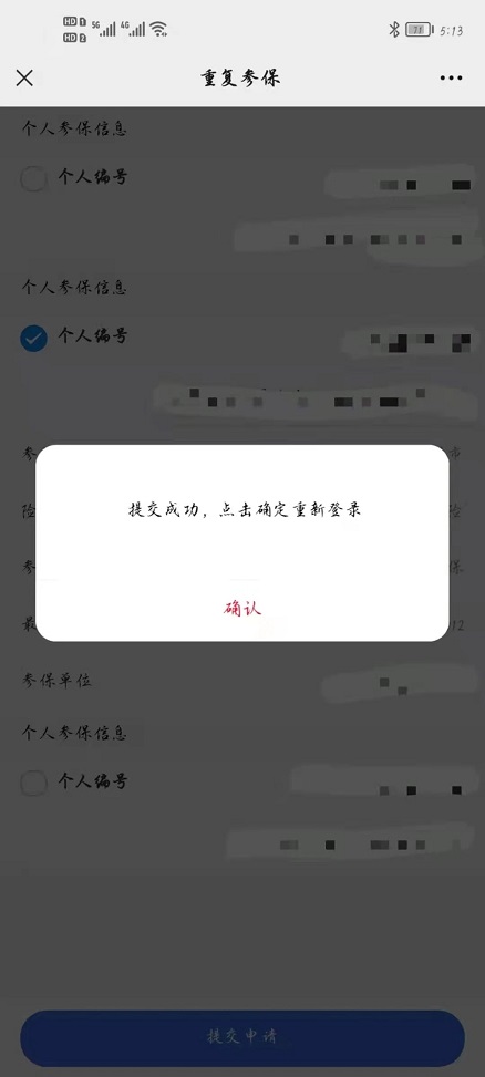 在“重復參保”頁面所列出所有的個人參保信息中,核對需要保留的參保信息